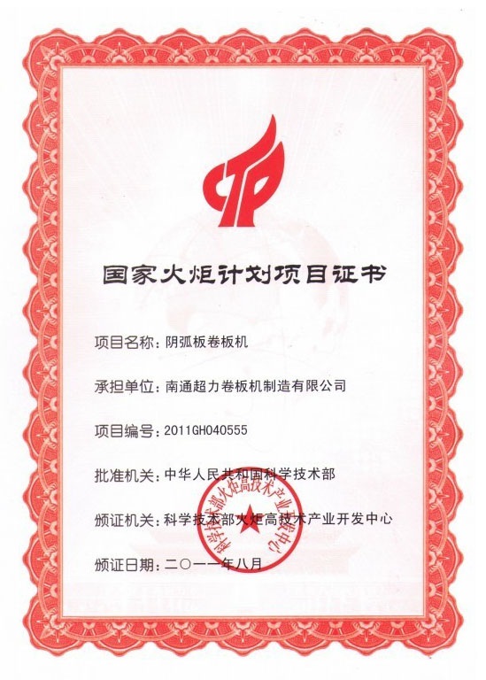 今年2月,南通超力卷板機制造有限公司正式接受到國家科技部頒發(fā)的“陰弧板卷板機”火炬計劃項目證書。至此,該火炬計劃項目正式立項。